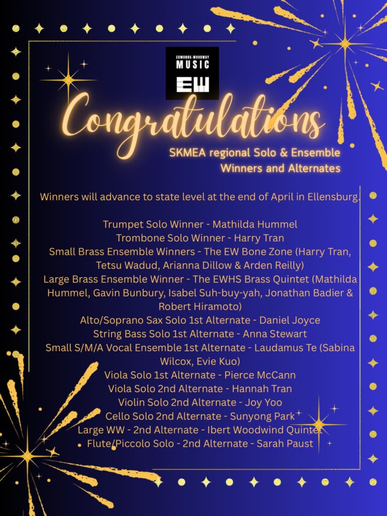 What a great showing at the Solo & Ensemble contest from Edmonds-Woodway! We had 2 solo winners, 2 ensemble winners, and many more EWHS musicians placed as alternates for the state competition in April.